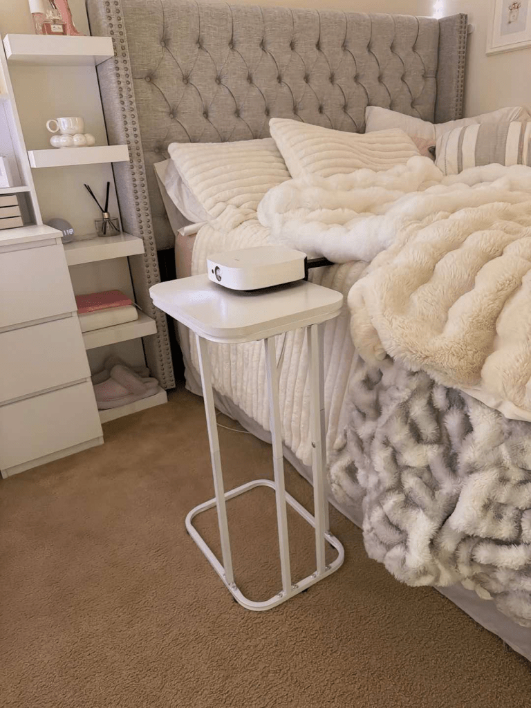 For added convenience, a C-shaped end table is the perfect bedside companion, offering a sleek, space-saving surface for essentials. Placing a projector on the table transforms your bedroom into a personal home theater, making movie nights more immersive and effortless.