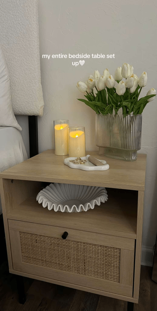 For a soft, elegant touch, place realistic artificial flowers in a simple vase, bringing life to your bedside without the upkeep. A ceramic jewelry tray keeps everyday accessories beautifully displayed while adding a chic, functional element.
