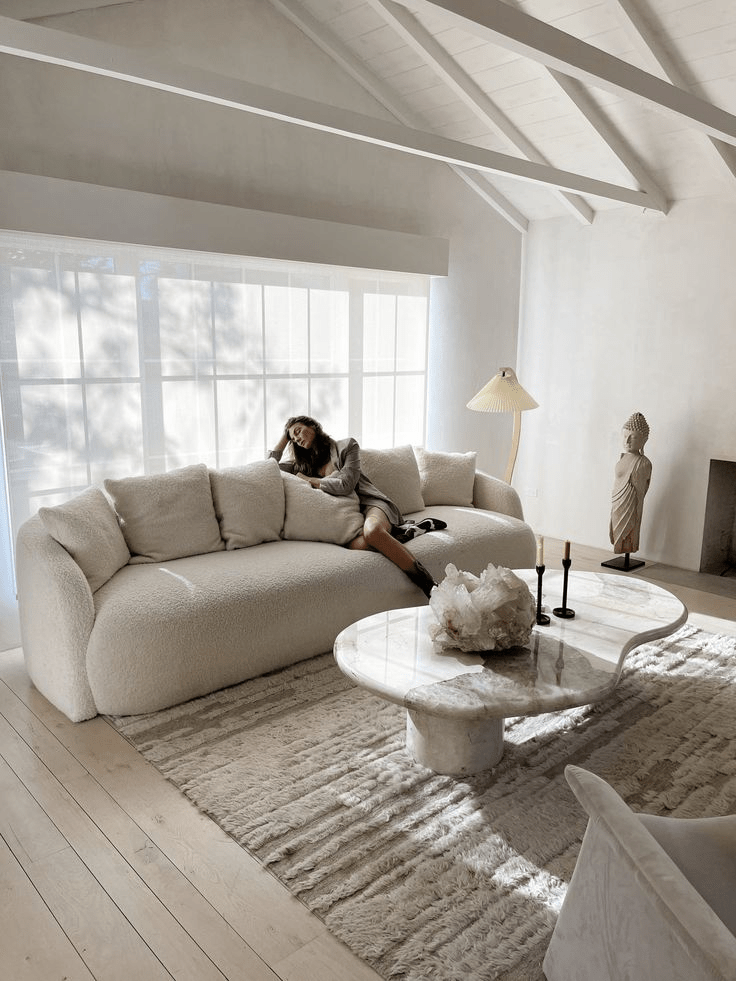 Parisian design embraces soft curves and plush textures, making the modern curved bouclé sofa a must-have. In neutral shades like cream, beige, or soft gray, this elegant silhouette adds warmth and sophistication to a living space. Its sculptural form pairs beautifully with classic Parisian elements like gold mirrors and marble accents.