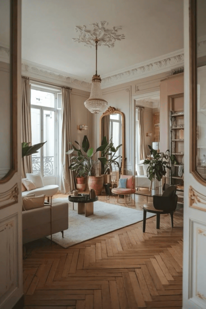 A French crystal chandelier is synonymous with Parisian luxury. Whether it’s a grand statement piece in the living room or a delicate touch in a bedroom, this lighting fixture transforms any space with its elegance. Opt for a traditional candle-style chandelier or a more contemporary crystal design to achieve an effortlessly chic look.