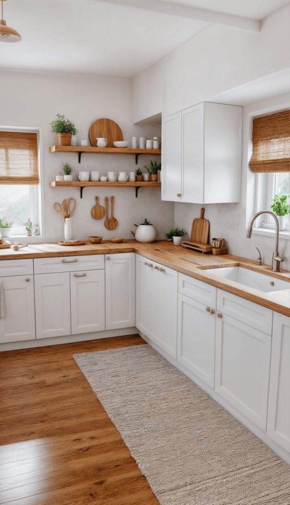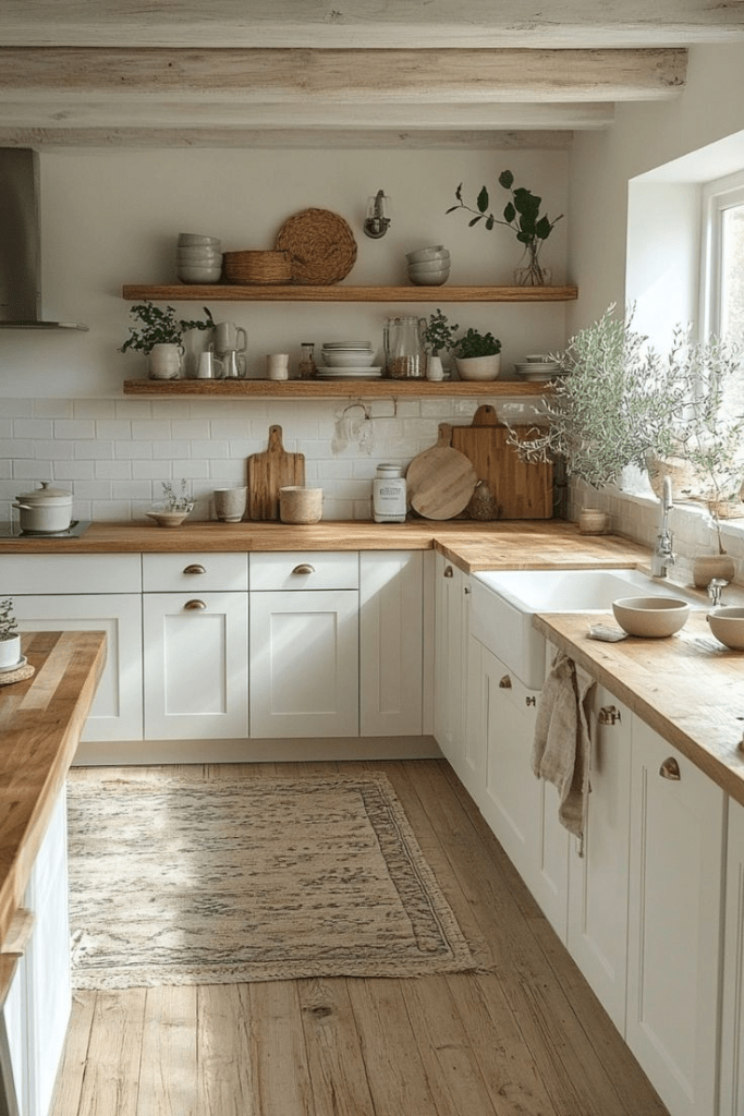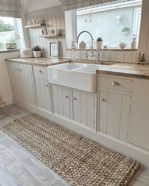 Adding a natural jute runner to your kitchen floor brings warmth and texture while maintaining the clean, airy aesthetic of Scandinavian design.