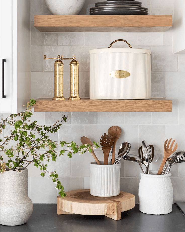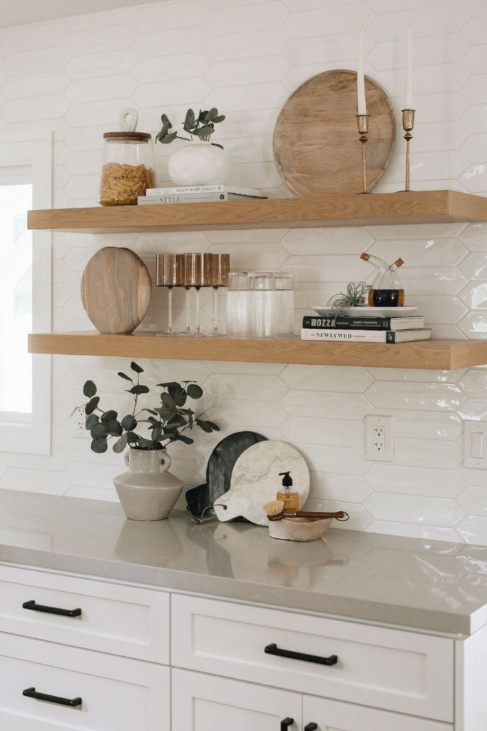 - Use Open Shelving – Wood floating shelves provide both storage and a chance to display beautiful dishware and kitchen essentials.
