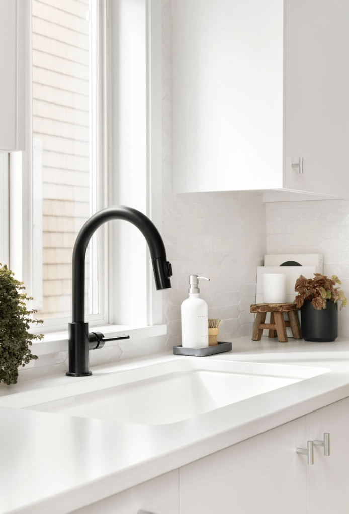A sleek black faucet contrasts beautifully with light-colored sinks and countertops, adding a bold, modern edge to your Scandinavian kitchen.