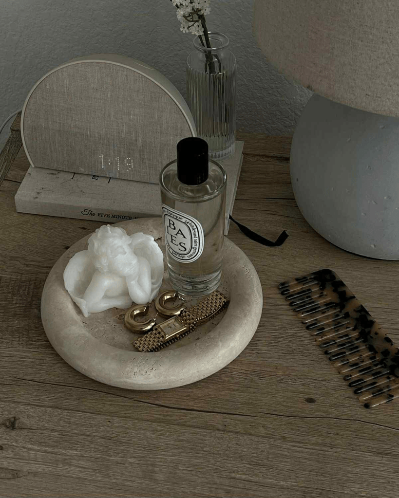 Imagine this—stacked on a soft neutral nightstand: a marble jewelry tray holding your prettiest perfume and a delicate angel-shaped candle (a touch of whimsy and peace, yes please). Add a leopard-print comb casually placed nearby, giving a subtle “cool girl who has it together” vibe.