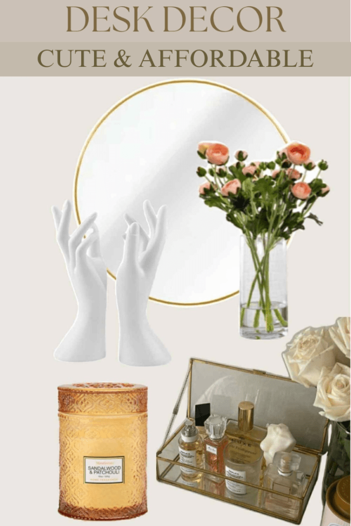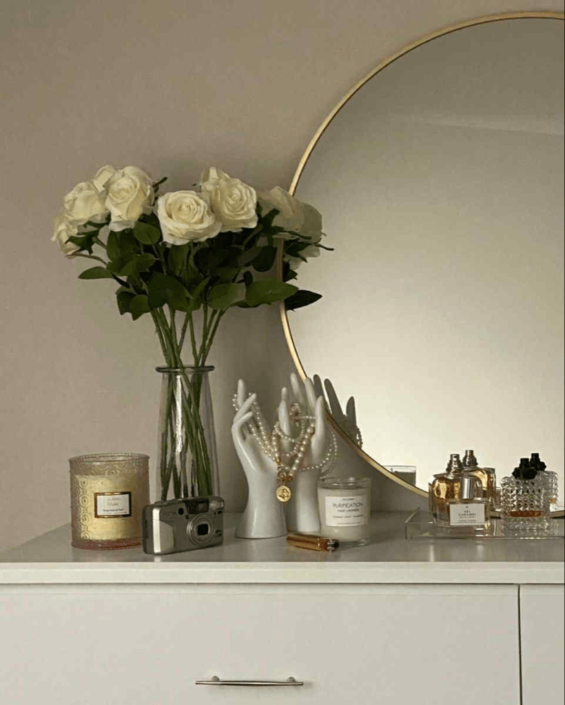 There’s something so satisfying about creating a little corner that feels beautiful and functional at the same time. A glass vase with fresh blooms, a gold frame mirror that bounces the light, a hand-shaped jewelry stand, glowing candles, and a chic jewelry organizer—it’s those small details that turn your dresser or nightstand into a space you actually love to look at every day.