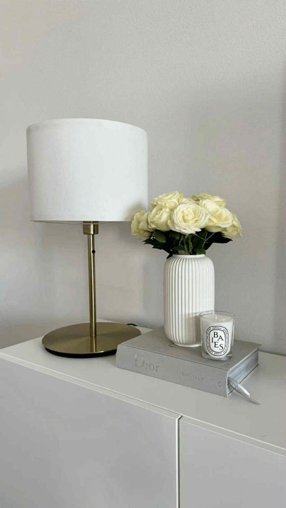 Luxury is in the details—and the right styling can instantly transform your bedroom or living room into a space that feels curated and timeless. Picture a sleek modern vase, a Dior book on the table, a classic table lamp, a softly glowing candle, and a bouquet of roses. It’s a mix that brings elegance without feeling overdone.