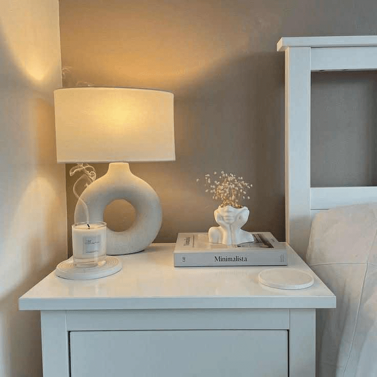 A white nightstand has this way of making a bedroom feel instantly calm, but it really comes to life with just the right details. I love the look of a sleek black or neutral table lamp casting a soft glow at night, paired with a book you actually reach for before bed. A lightly scented candle brings in that cozy, lived-in atmosphere, while a small ceramic sculptural vase adds just enough personality to keep things from feeling too plain. It’s simple, clean, and effortlessly chic. It’s the kind of setup you’ll never get tired of.