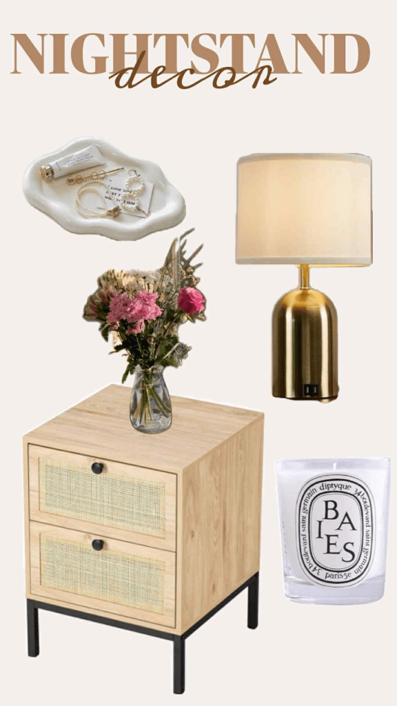 A rattan nightstand instantly adds warmth and texture to a bedroom, and when styled right, it feels both cozy and elevated. Pair it with a sleek modern lamp with gold detailing, add a softly scented candle, and finish the look with a simple white cloud-shaped jewelry tray. It’s that perfect mix of practical and aesthetic so your bedside suddenly feels curated, not cluttered.