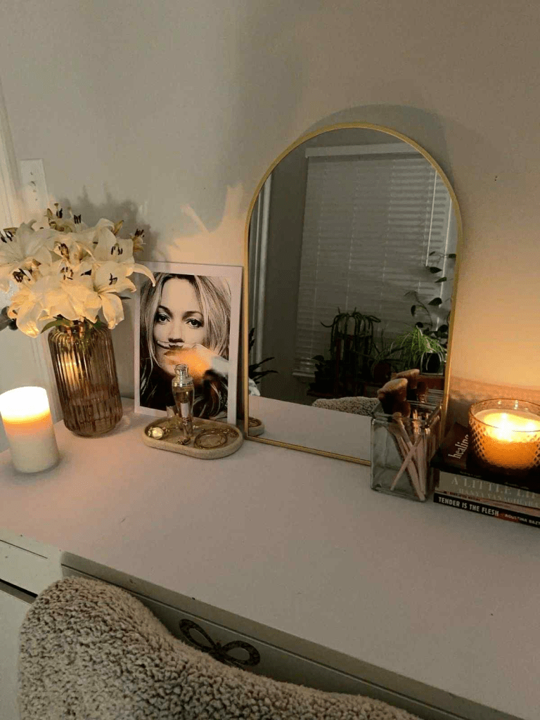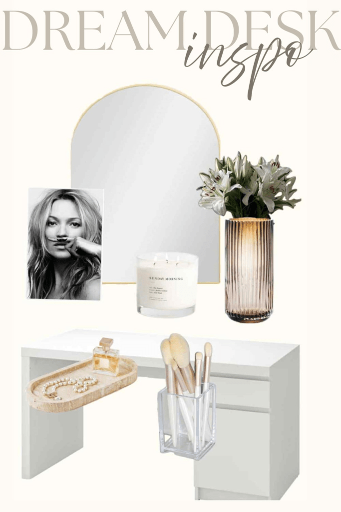 If you’ve been dreaming of that perfect desk or vanity setup that feels straight off a Pinterest board, this minimalist Scandinavian-chic look is it. A crisp white desk sets the stage, instantly giving your space that clean, airy vibe. Add a striped glass vase with a single stem for effortless style, then let a gold-framed mirror bounce the light and make the whole setup feel luxe. A Kate Moss print tucked against the wall adds that cool-girl edge, while a sleek jewelry tray and chic holders for makeup brushes keep everything polished yet practical.