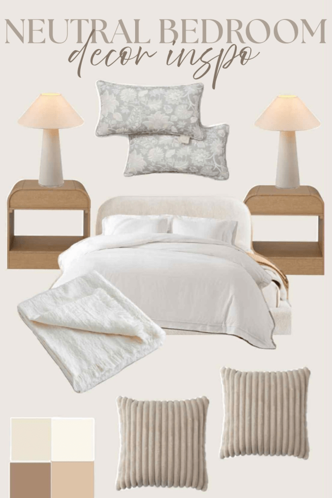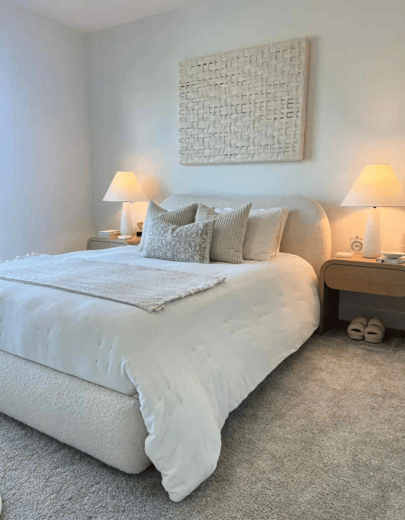 A neutral minimalist bedroom is all about creating calm without losing comfort. A soft bouclé bed becomes the centerpiece, its textured finish adding quiet luxury. Pair it with modern wooden nightstands to bring in warmth and balance. On top, sleek table lamps set the tone with a soft glow that makes the whole room feel grounded. A fluffy comforter adds that touch of coziness everyone craves, while a linen throw blanket draped casually over the edge introduces light layers. Finally, decorative throw pillows pull everything together, making the space look styled yet livable.