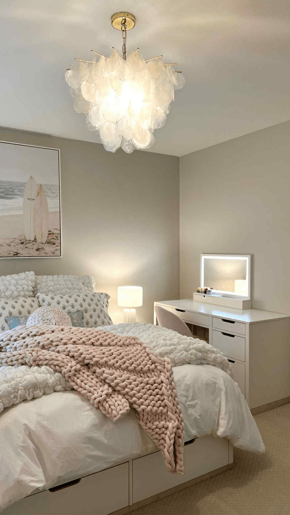 There’s nothing like stepping into a bedroom that feels both stylish and comforting, and the secret is in the bedding layers. A pink chunky knit blanket instantly adds warmth and texture, giving the bed that inviting, lived-in look. Pair it with floral sheets for a soft, romantic touch that feels timeless yet fresh. A white ruched comforter creates the perfect cloud-like base, while decorative throw pillows bring in personality and balance. Overhead, a chic chandelier adds just the right amount of drama, pulling the whole space together into a cozy retreat you’ll never want to leave.