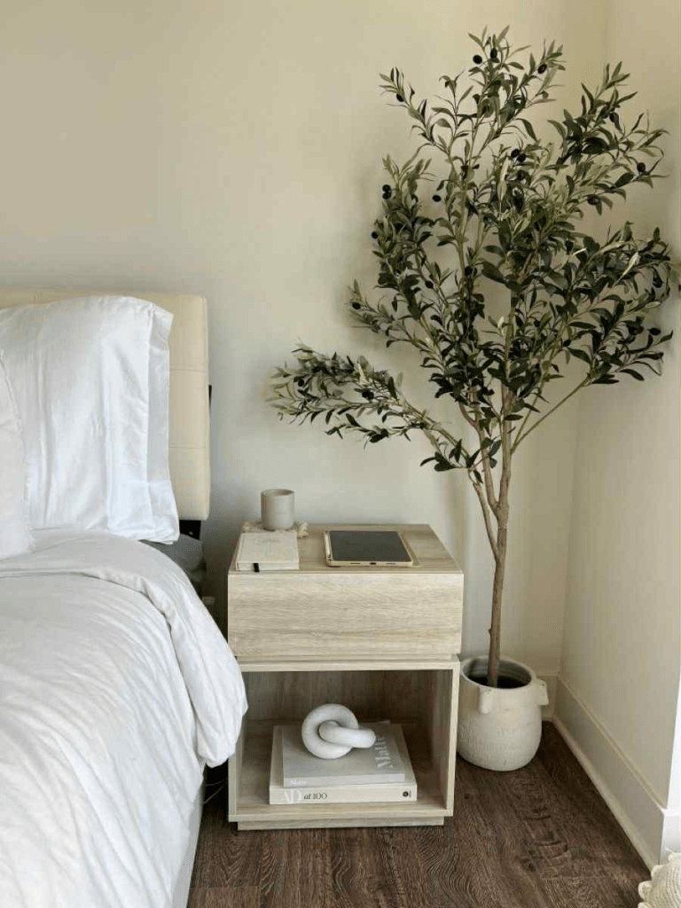 A minimalist bedroom feels instantly calming when styled with the right details. A white oak nightstand sets the tone with its warm, natural finish that blends effortlessly into a clean, neutral space. Next to it, a high-quality artificial olive tree adds height and greenery without the upkeep, bringing that fresh, organic feel indoors. On the nightstand, a wooden knot ornament works as an understated statement piece—sculptural yet simple. A small stack of table books completes the look, balancing function and style while giving your bedside personality.